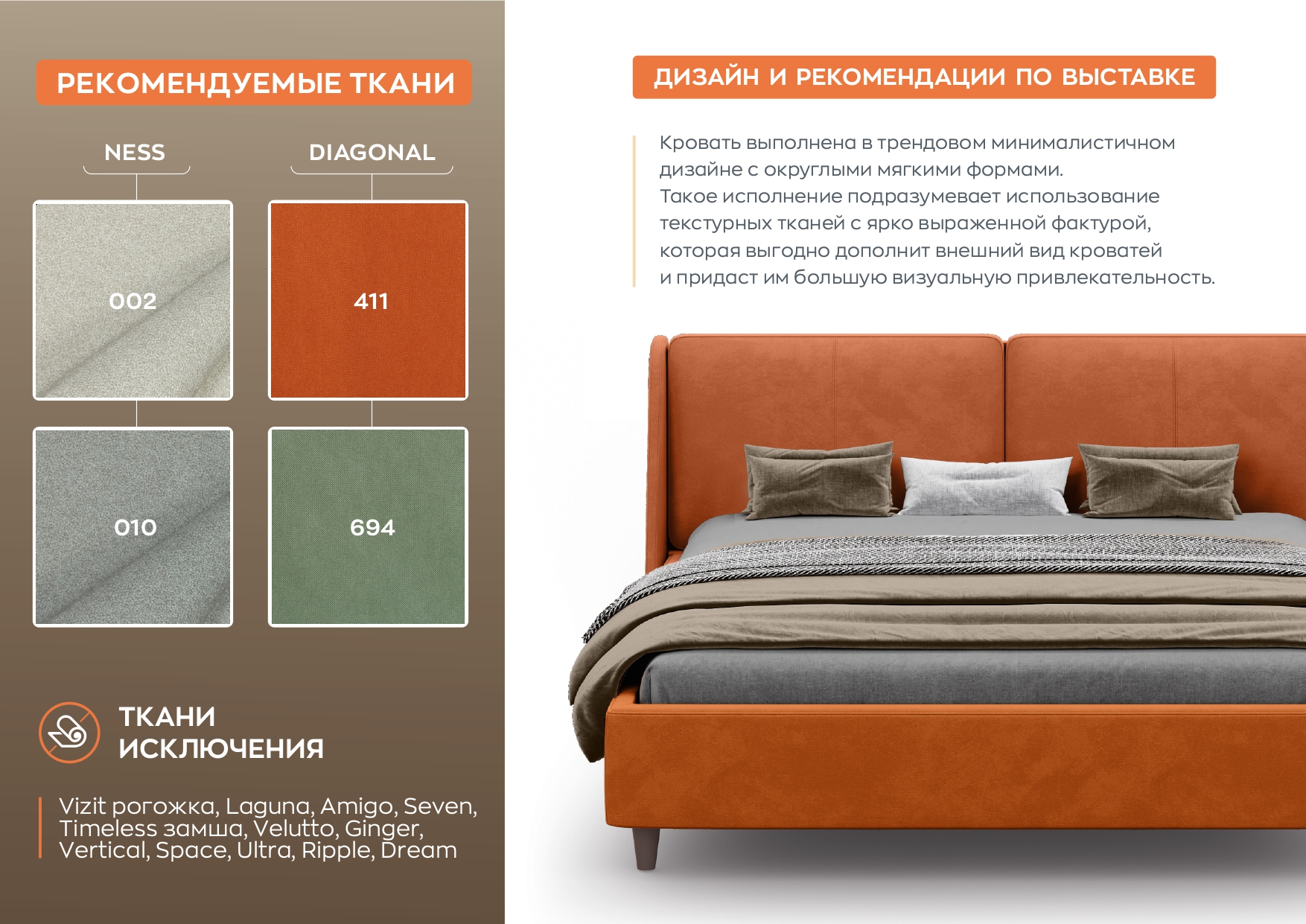 Рогожка «Bjork», Микровелюр «Omega», Велюр «Enigma», iБукле «Ness», Велюр «Nebby», Рогожка «Sherlock», Микровелюр «Happy», Велюр «Teddy», Велюр «Teddy Evolution», Велюр «Teddy Exclusive», Велюр «Moss», Рогожка «Wellton», Велюр «Zizi», Велюр «Marsel», Букле «Pique», Велюр «Brabus», Велюр «Goya», Велюр «Sanremo», Велюр «Diagonal», Велюр «Grain»